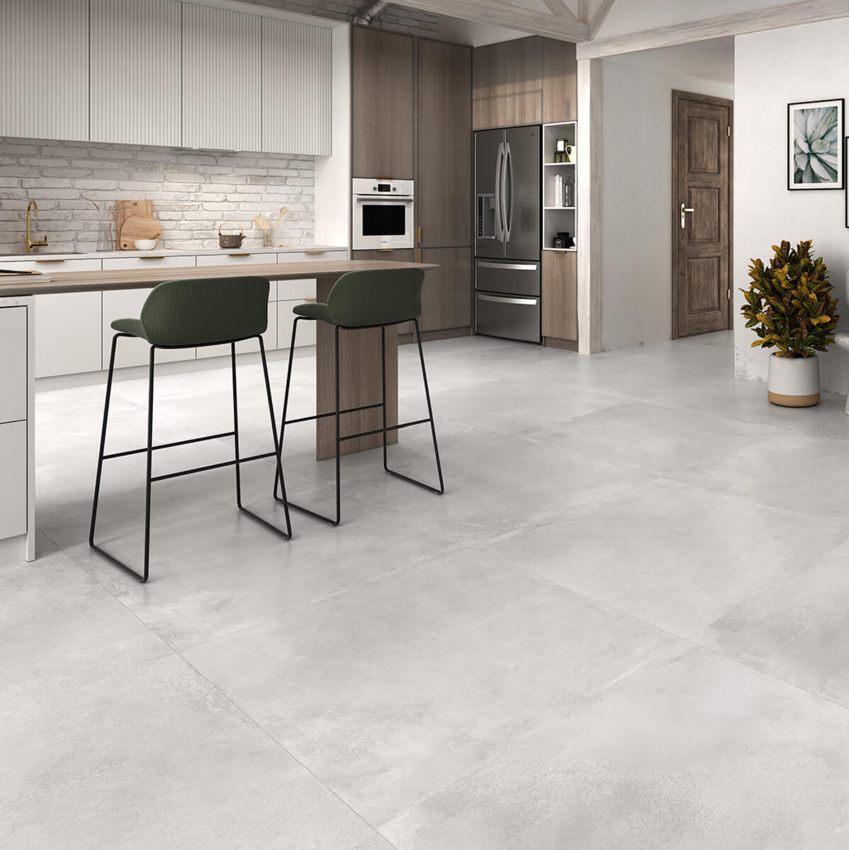 The open pearl colour of the tile creates a sense of space whilst the industrial effect of the concrete creates a beautiful urban effect in any floor space. A stunning modern look with durable and sturdy tiles.