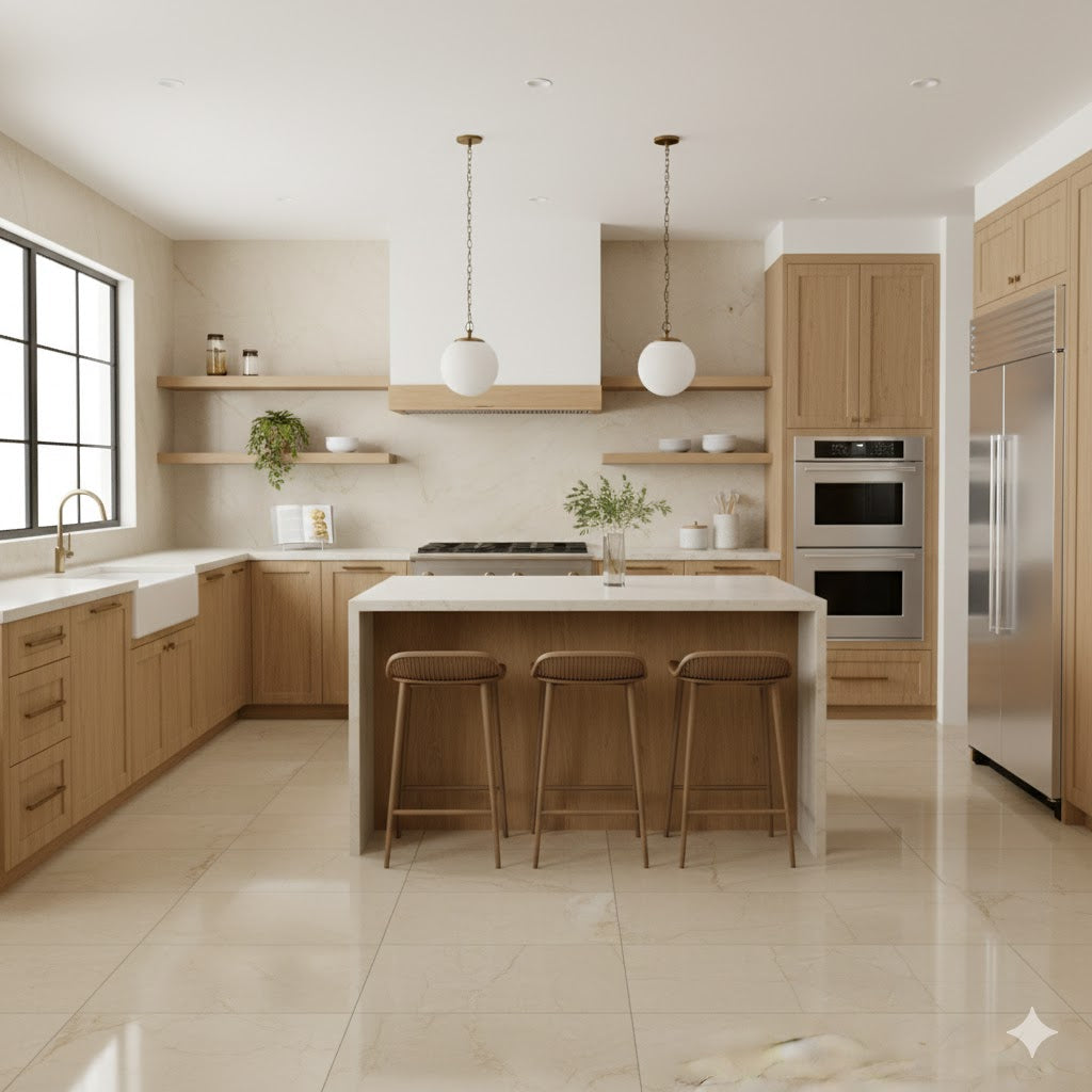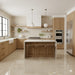 A light beige marble effect tile with soft darker beige veining. Designed to infuse a rustic and luxurious vibe into a floor space.