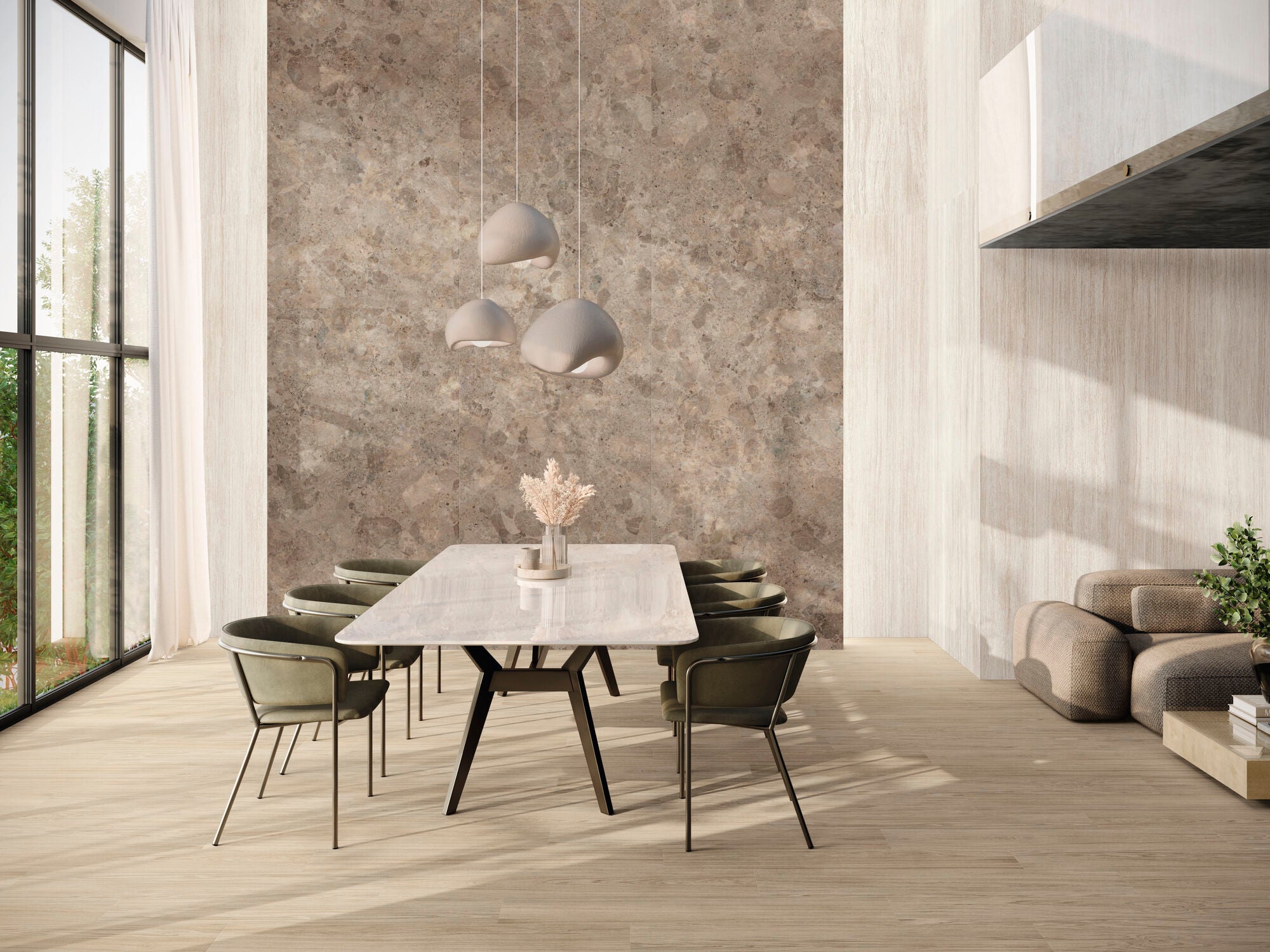 The polished counterpart to Sabbia Natural — same warm sand hue, but with a luminous, reflective surface that enhances light and adds contemporary glamour.